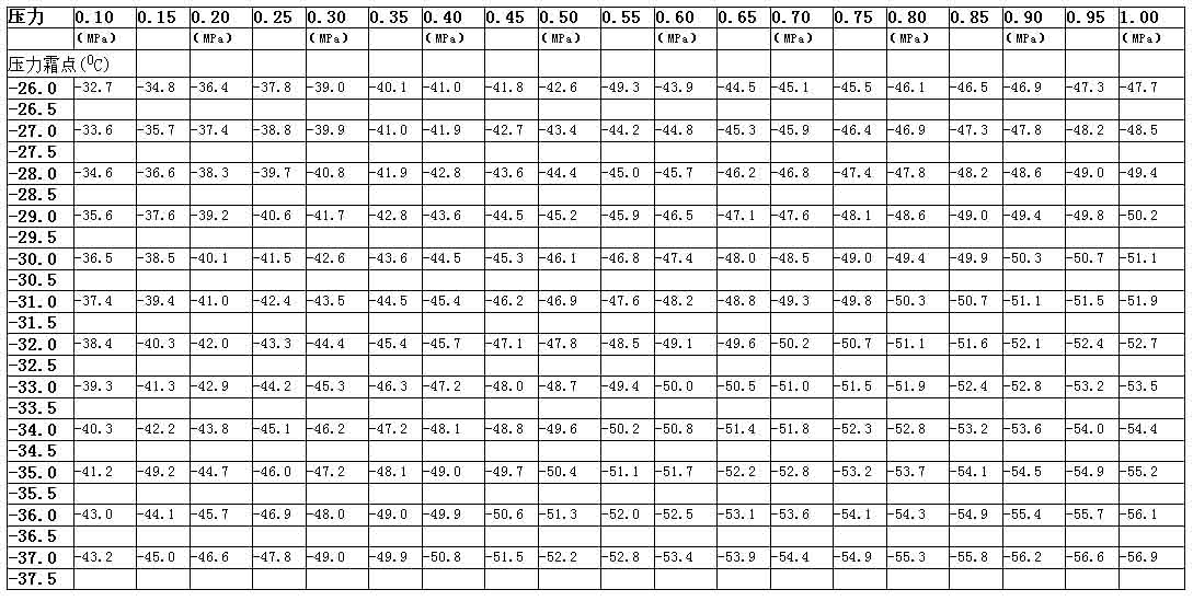 壓力霜點(露點)——壓力——常壓霜點(露點)對應的關系表
