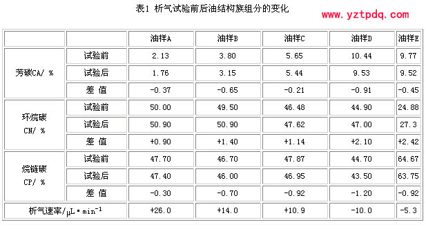 注: ① 油樣A、B、C均為環(huán)烷基油,油樣D為油樣A加濃縮芳烴而成;② 油樣E為石蠟基油加濃縮芳烴而成,析氣試驗后,析氣池中有淡黃色蠟狀物。