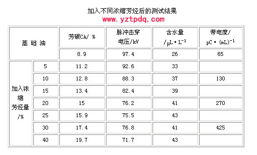 (1) 降低了油的沖擊擊穿強(qiáng)度。工頻擊穿電壓與脈沖擊穿電壓影響因素不同,工頻擊穿電壓值主要受水分、雜質(zhì)等影響,可以通過(guò)油處理得到提高;脈沖擊穿強(qiáng)度主要受油組分影響,油中含雜環(huán)芳烴和膠質(zhì)多時(shí),擊穿電壓下降明顯。變壓器,特別是超高壓變壓器,在試驗(yàn)和運(yùn)行中都會(huì)遇到不同波形和幅值的沖擊電壓,提高油的耐沖擊強(qiáng)度是有實(shí)用意義的。表2為原克煉基礎(chǔ)油加入不同量的濃縮芳烴后,脈沖擊穿電壓值隨增加量的變化。