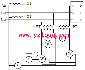對(duì)于單相電力變壓器,可采用圖1-1所示的接線進(jìn)行空載試驗(yàn)。對(duì)于三相電力變壓器,可采用圖1-2和圖1-3所示的兩瓦特表法進(jìn)行空載試驗(yàn)。圖1-2為直接測(cè)量法,適用于額定電壓和電流較小,用電壓表和電流表即可直接進(jìn)行測(cè)量的電力變壓器。當(dāng)電力變壓器額定電壓和電流較大時(shí),必須借助電壓互感器和電流互感器進(jìn)行間接測(cè)量,此時(shí)采用圖1-3接線方式。