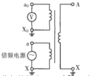 分級絕緣的電壓互感器一次繞組末端絕緣水平很低,只有5kV左右,因此一次繞組末端不能與首端承受同一試驗電壓,只能采用感應耐壓的加壓方式,即把電壓互感器一次繞組末端接地,從某個二次繞組加壓,在一次繞組感應所需要的試驗電壓。為避免工頻感應耐壓試驗電壓過高引起鐵心飽和及勵磁電流過大損壞被試電壓互感器,通常進行倍頻感應耐壓試驗。