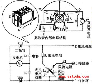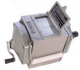 用于測量高值電阻和絕緣電阻的儀表叫做搖表,現(xiàn)在新型產(chǎn)品通常稱為絕緣電阻測試儀或者絕緣電阻表,有時也稱為兆歐表。其中老款搖表的外形如下右圖所示:搖表(絕緣電阻表)主要結(jié)構(gòu)是由手搖發(fā)電機(jī)、電磁式無機(jī)械反作用的表頭組成,對外有接線柱(L:線路段、E:接地端、G:屏蔽端)。新型的絕緣電阻測試儀通常和數(shù)字萬用表差不多的外形。