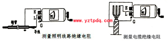 搖表(兆歐表)有三個測量端鈕,一個線路端鈕(L),另一個是接地端鈕(E),還有一個為屏蔽端鈕(G)。一般測量照片或電力線路對地的絕緣電阻時,只用L和E端,接線如下左圖所示。“L”端接到被測設(shè)備的“火”或“相端”,“E”端接到被測設(shè)備的“地”端。在測量電纜對地絕緣電阻時或被測設(shè)備的漏電流嚴(yán)重時,使用“G”端鈕。如下右圖所示為測量電纜絕緣電阻接線圖。