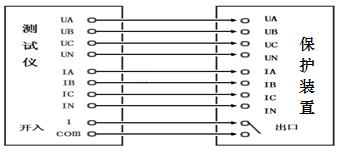 假設(shè):低電壓閉鎖定值為60V(指線電壓),過(guò)電流定值為5A。將測(cè)試儀的UA、UB、UC、UN;IA、IB、IC和IN分別接入變壓器后備保護(hù)的交流輸入端,同時(shí)將保護(hù)出口跳閘接點(diǎn),接入測(cè)試儀的開(kāi)關(guān)量輸入端1,設(shè)置IA=6A,IB=IC=0,UA=UB=UC=57V,相位互差120度。選擇UA、UB和UC同時(shí)可變,60/1.732=34.64,用【手動(dòng)試驗(yàn)】方式同時(shí)遞減三相電壓,當(dāng)UA=UB=UC=34.64V時(shí),保護(hù)動(dòng)作。