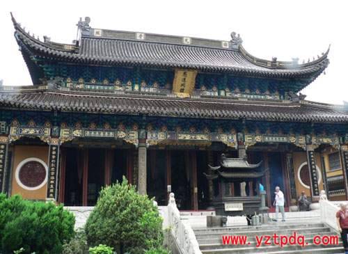 從山門進入寺院,首先映人眼簾的是前殿。大雄寶殿的正中是釋迦牟尼裝金佛像,佛體神圣莊嚴,神態(tài)慈祥端莊,仿佛正時時處處關切著所有向他膜拜的人們。佛龕呈六角狀,六根木雕龍柱工藝精湛,佛龕的頂部站立著伸展巨翅的靈鷲。m.yzmpos.com靈鷲山俗稱靈山,因山上多靈鷲而得名。傳說釋迦牟尼當年就在靈山傳經(jīng)布道。大雄寶殿兩側沒有像一般寺院那樣矗立十八尊羅漢法身塑像,而是供奉竹禪大師題跋書畫十八尊羅漢像的浙江天童寺“照畫石刻’’拓片。照畫石刻拓片十八尊羅漢像,具有很高的藝術價值,在當今漢傳佛教中十分罕見。