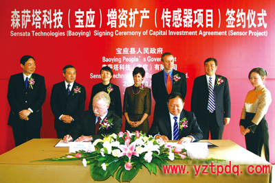 1月19日中午,美國(guó)森薩塔科技公司在揚(yáng)州與我縣簽訂增資擴(kuò)產(chǎn)協(xié)議,市委書(shū)記、市人大常委會(huì)主任王燕文,市委副書(shū)記、市長(zhǎng)謝正義,副市長(zhǎng)聞道才,森薩塔科技總裁兼首席運(yùn)營(yíng)官瑪莎·蘇利文女士,森薩塔科技執(zhí)行副總裁、首席財(cái)務(wù)官杰夫·科特先生,森薩塔科技運(yùn)營(yíng)高級(jí)副總裁迪克·丁先生,縣委書(shū)記、縣人大常委會(huì)主任仲生,縣委副書(shū)記、縣長(zhǎng)王庭國(guó),縣委副書(shū)記周玉寶,副縣長(zhǎng)顧長(zhǎng)榮以及市經(jīng)信委、商務(wù)局、質(zhì)監(jiān)局、海關(guān)、商檢局和我縣相關(guān)負(fù)責(zé)人等出席簽約儀式。