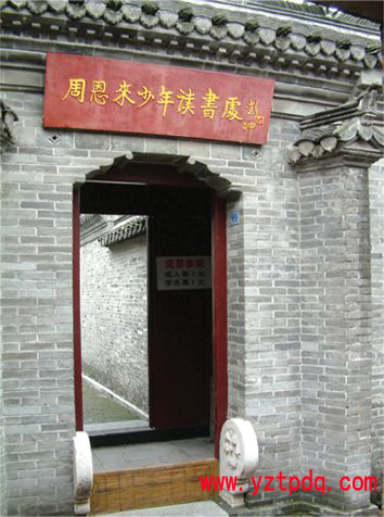 周恩來少年讀書處位于揚州市寶應縣城水巷口3號,原為周恩來外祖父陳沅的宅第。整個建筑為明清風格,占地700平方米,建筑面積500平方米,共有房屋十八間。讀書處人門朝北,門樓古樸莊重,門楣上方是原全國人大常委會副委員長彭沖親筆題寫的“