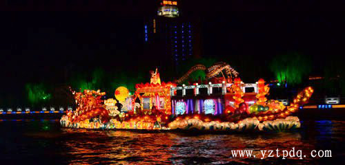 領(lǐng)航花船“揚(yáng)州號(hào)”是所有船只中體量最大的,它首先啟航,駛向夜色中,其他花船隨后次第駛來(lái)。記者看到,緊隨“二分明月”揚(yáng)州號(hào)的是“潮涌廣陵”的廣陵號(hào),隨后,“歌吹維揚(yáng)”的維揚(yáng)號(hào)、“百年冶春”的揚(yáng)子江號(hào)、“明月星輝”的新城西區(qū)號(hào)、“田園邗江”的邗江號(hào)、“山水儀征”的儀征號(hào)、“水潤(rùn)揚(yáng)州”的水利號(hào)、“