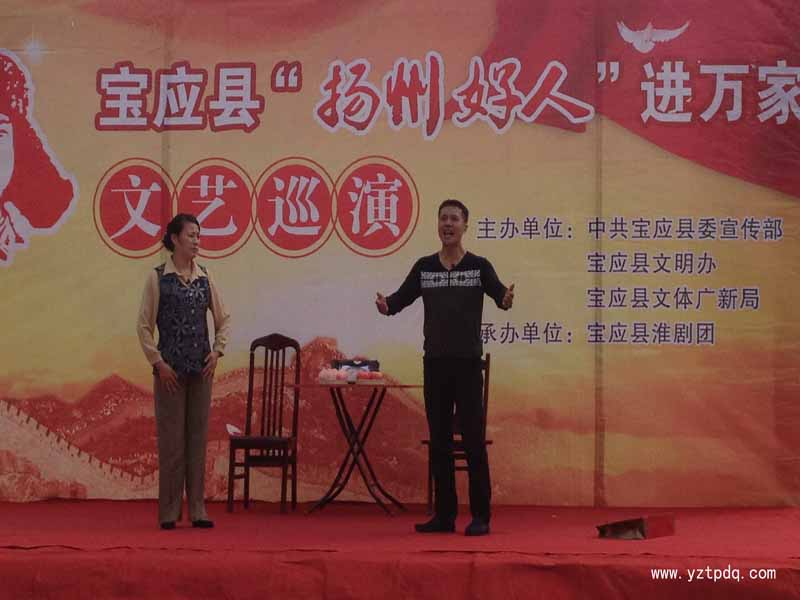 寶應(yīng)縣淮劇團(tuán)的演員們以農(nóng)民朋友喜聞樂(lè)見的淮劇形式,展現(xiàn)了愛崗敬業(yè)馬小梅、36年如一日照顧特殘軍人丈夫?qū)O云鳳、十年四救落水者的平民英雄張志成、用孝行和大愛撐起整個(gè)家的李順梅以及視腦癱小姑子如親妹、待多病的婆婆勝似親媽蔣長(zhǎng)鳳等5位“揚(yáng)州好人”的風(fēng)采。他們精彩的演出博得了現(xiàn)場(chǎng)觀眾的陣陣掌聲。全鎮(zhèn)近千名群眾觀看了演出,通過(guò)文藝巡演傳遞了正能量,弘揚(yáng)了新風(fēng)尚。