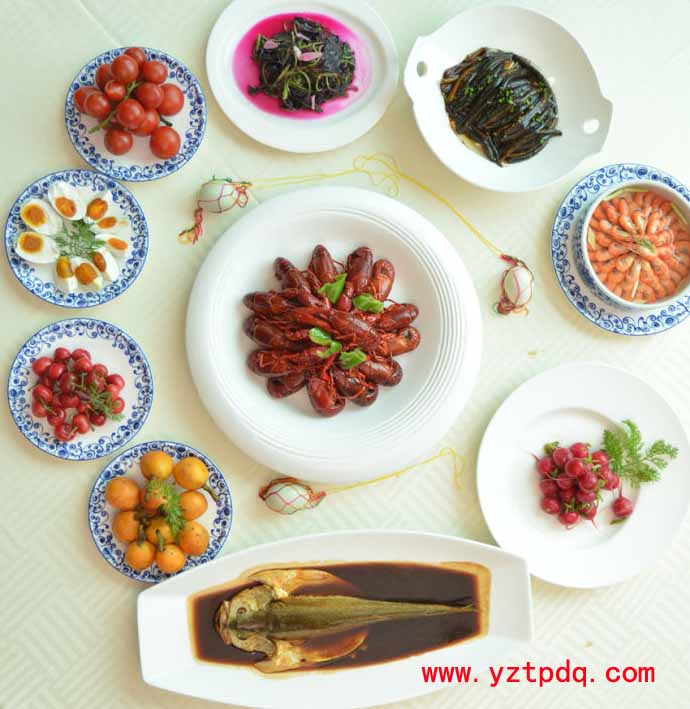 每到端午節(jié)的這一天,揚(yáng)州人家中午一定要回家“嘗午”。所謂“嘗午”就是吃十二紅,是揚(yáng)州人過(guò)端午節(jié)特有的習(xí)俗。“十二紅”是指十二樣自然紅色,或經(jīng)烹調(diào)后顏色發(fā)紅的時(shí)令菜肴,通常有咸鴨蛋、煮黃魚、粉皮拌黃瓜、炒蝦子、炒紅莧菜、燒仔鵝、洋花蘿卜、櫻桃、枇杷、紅杏、干菜燒肉、炒長(zhǎng)魚、紅燒扒蹄、火腿、香腸、雄黃酒等。一般分為4碗8碟,即4個(gè)涼拌,4個(gè)熱炒,4個(gè)燒菜。這個(gè)數(shù)字代表每年的十二個(gè)月,再者它也兼顧了每年的四時(shí)八節(jié)。