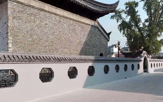 二期工程主要包括學(xué)宮圍墻的建立。因?qū)殤?yīng)學(xué)宮在寶應(yīng)城中小學(xué)內(nèi),為保證學(xué)生的人身安全,同時(shí)也出于保護(hù)古建筑的目的,寶應(yīng)學(xué)宮在大成殿和明倫堂的外圍建立了仿古圍墻。整個(gè)圍墻仿明清時(shí)代建筑風(fēng)格,建造的扇形拱門(mén)鑲上了花邊屋檐,引人入勝,更仿造古典園林造園藝術(shù),在圍墻上裝上了花格窗,以達(dá)到“移步換景”的目的。透過(guò)花格窗向里看寶應(yīng)學(xué)宮,更別有一番風(fēng)味。