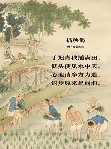 “手把青秧插滿田,低頭便見(jiàn)水中天。六根清凈方為道,退步原來(lái)是向前。”插秧偈