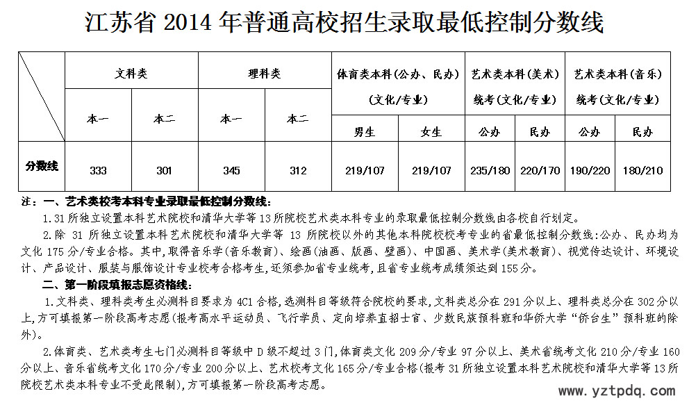2014年6月24日下午,江蘇省高校招生委員會召開會議,審議通過了2014年江蘇省普通高校招生第一階段錄取各批次省最低控制分數(shù)線。其中,文科:一本333、二本301;理科:一本345、二本312;藝術(文化/專業(yè))公本235/180、民本220/170; 體育(文/專)男219/107、女219/107。